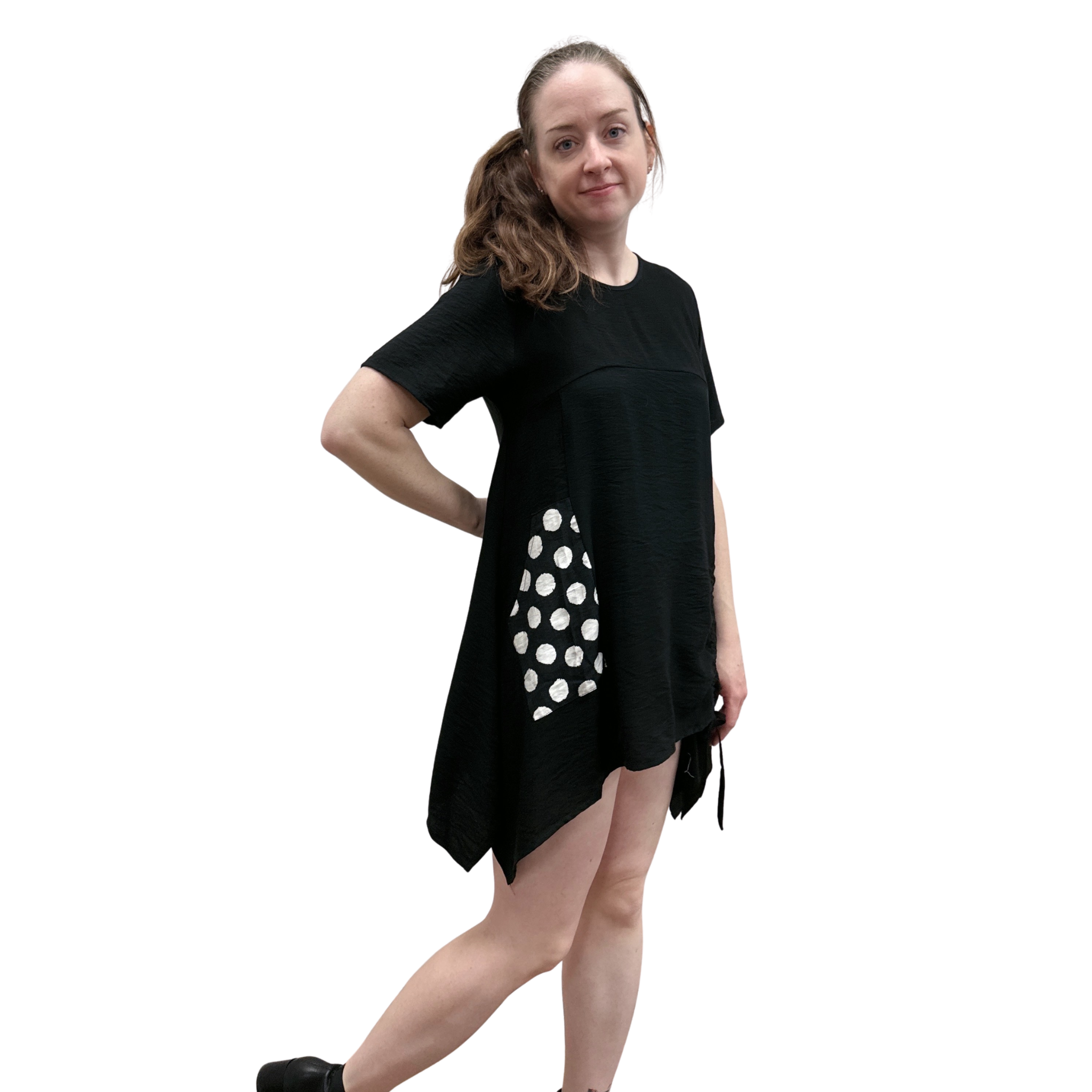 This easy short-sleeve dress features a relaxed silhouette with a playful polka dot pocket and an adjustable drawstring waist for customizable shape. It’s the kind of piece that feels effortless yet pulled together—perfect for busy days that still call for style.