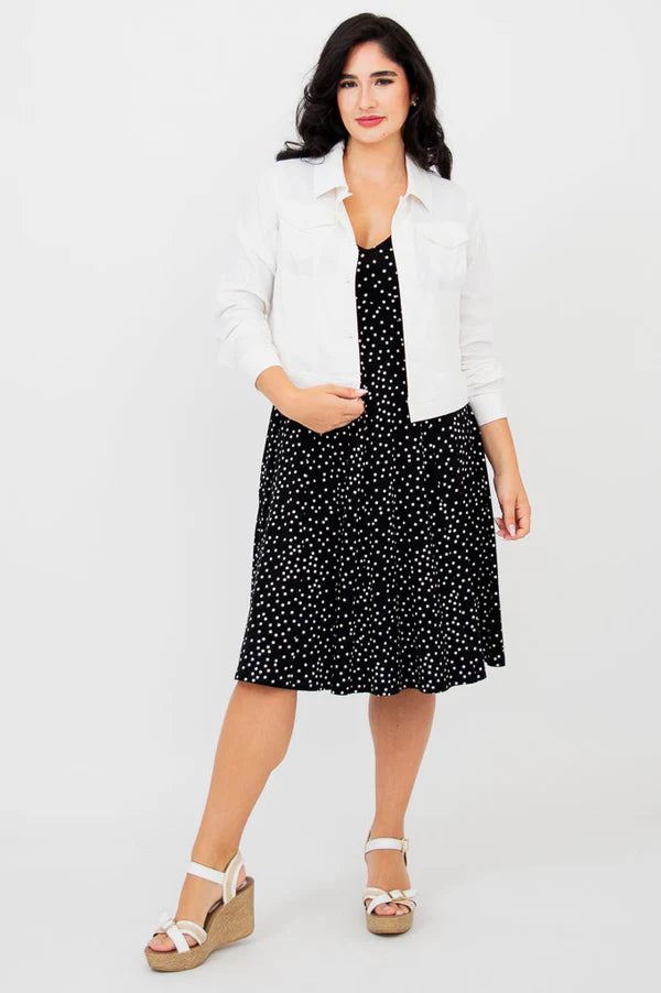 Designed with a familiar button-front silhouette, chest pockets, and long sleeves, the Colleen Jacket delivers a polished yet relaxed look that pairs effortlessly with dresses, denim, or casual separates. The lightweight fabric allows for comfortable movement while maintaining a clean, tailored shape.