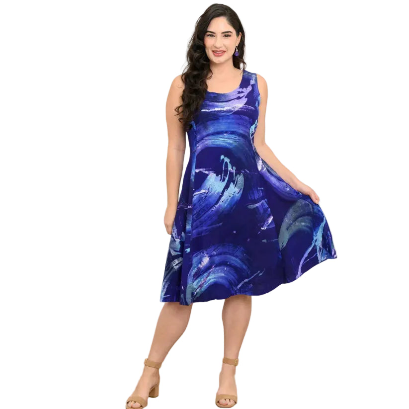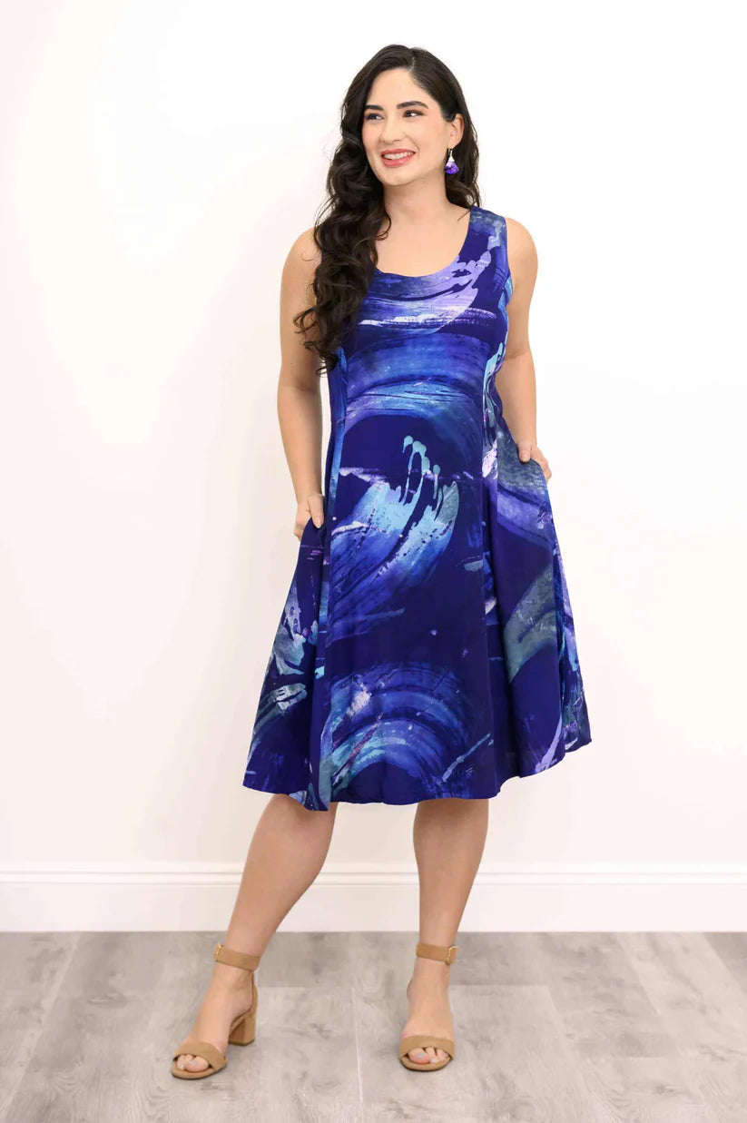 Designed with a scoop neckline and wide straps for comfortable coverage, the Sara Dress is elevated by subtle shaping details like princess seams and an adjustable tie-back waist—allowing you to customize your fit while maintaining a relaxed feel. Functional side pockets add everyday practicality, while the vibrant Ocean Breeze print brings a bold yet wearable statement to your wardrobe.
