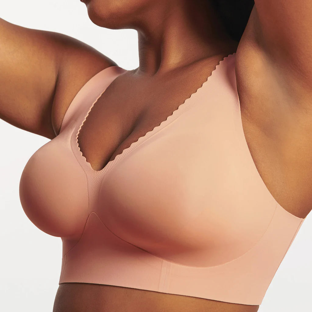 Flattering plunge, wire-free lift, and a blush-toned neutral you’ll forget you’re wearing.