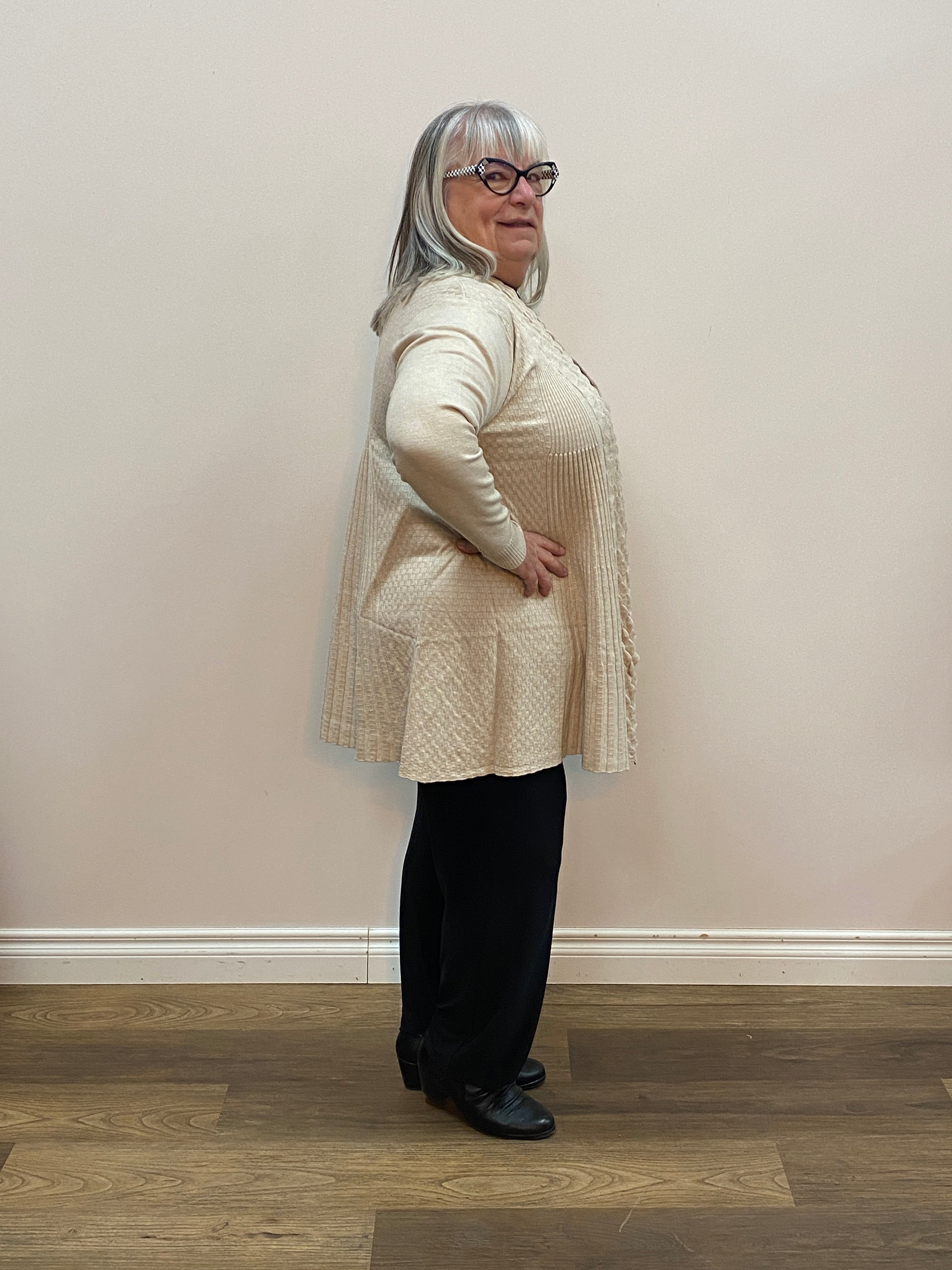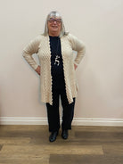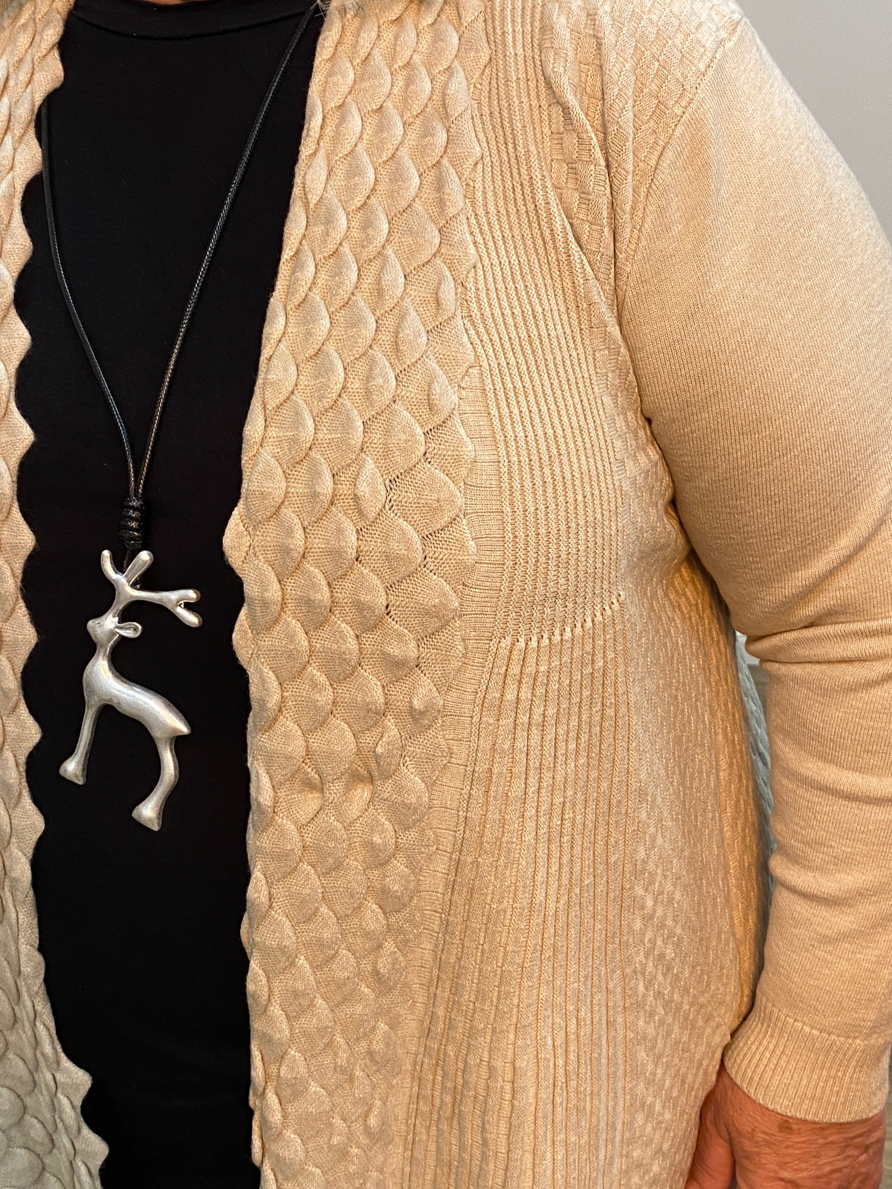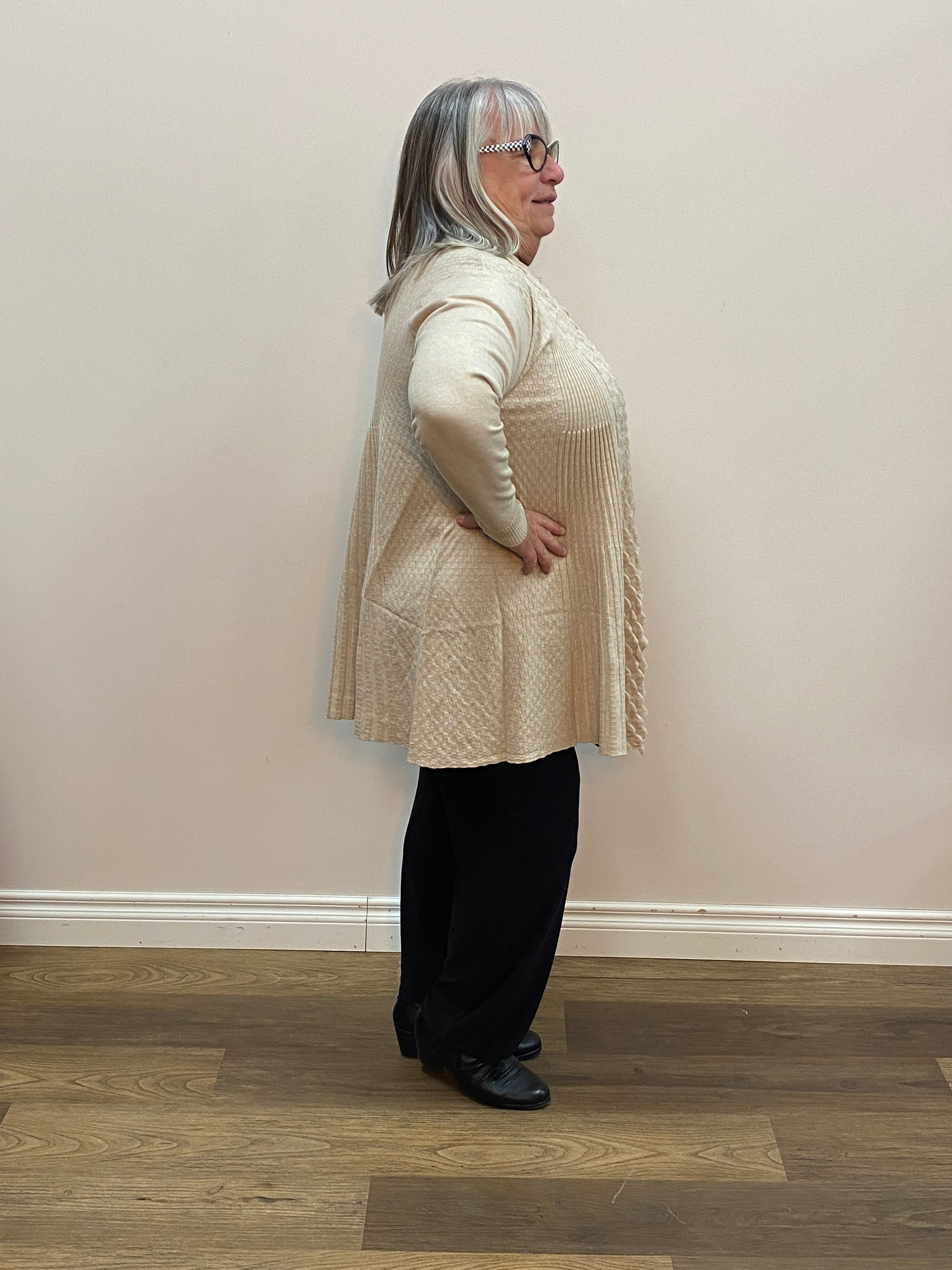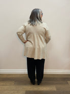 The Elevate Longline Cardigan in Oatmeal blends beautiful texture with an easy, flowy silhouette that flatters every body. The dimensional knit along the front adds subtle sophistication, while the vertical ribbing through the sides creates a lengthened, streamlined look. The gentle swing-back design drapes away from the body for effortless movement without cling, making this cardigan a go-to layer for work, weekends, and everything in between. The warm Oatmeal shade brings softness and versatility to your wardrobe, pairing beautifully with blacks, denims, creams, and earth tones.