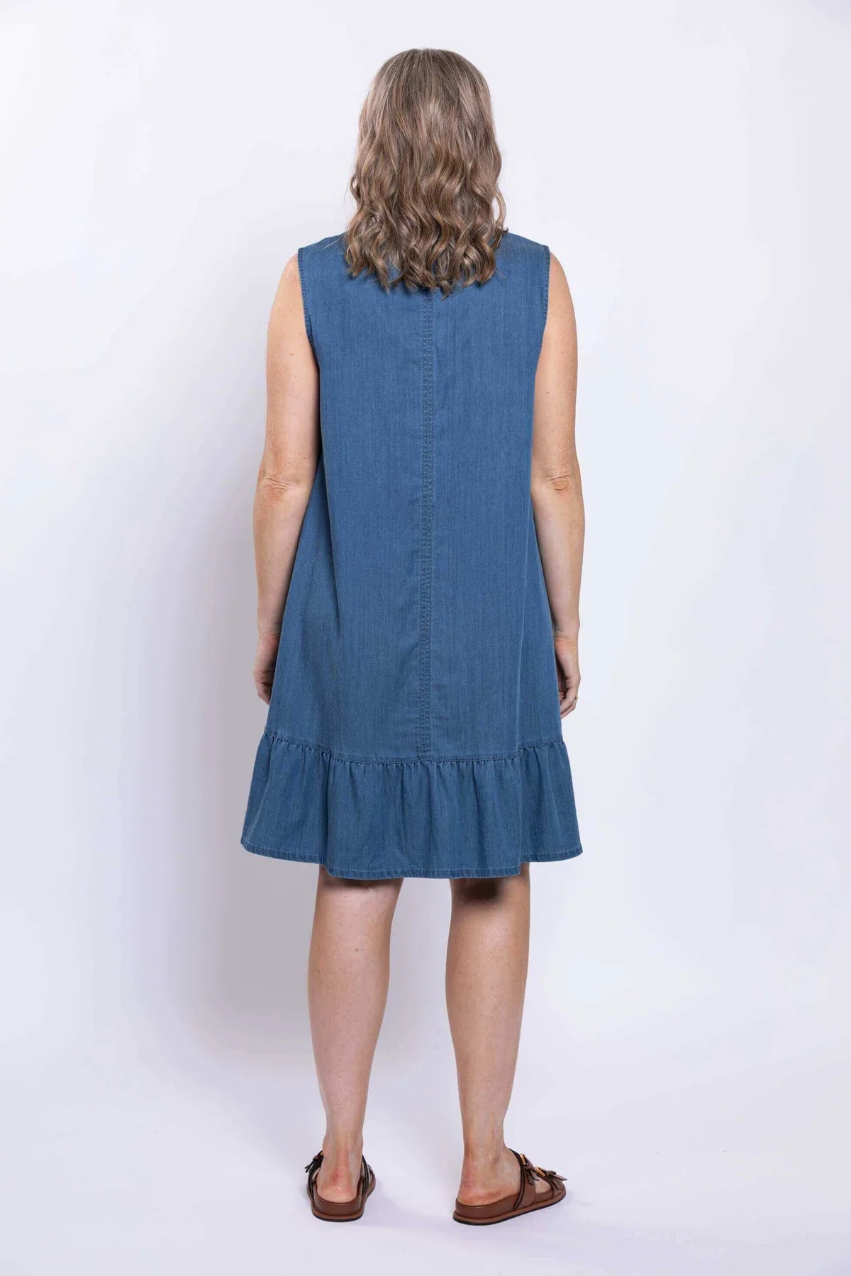 Featuring a sleeveless silhouette and a classic scoop neckline, the Lali Dress delivers a clean, minimal look that’s easy to style. The relaxed A-line shape gently skims the body, while the subtle ruffle hem adds soft movement and a feminine finish. Thoughtfully placed front patch pockets bring both function and visual interest, making this piece as practical as it is versatile.