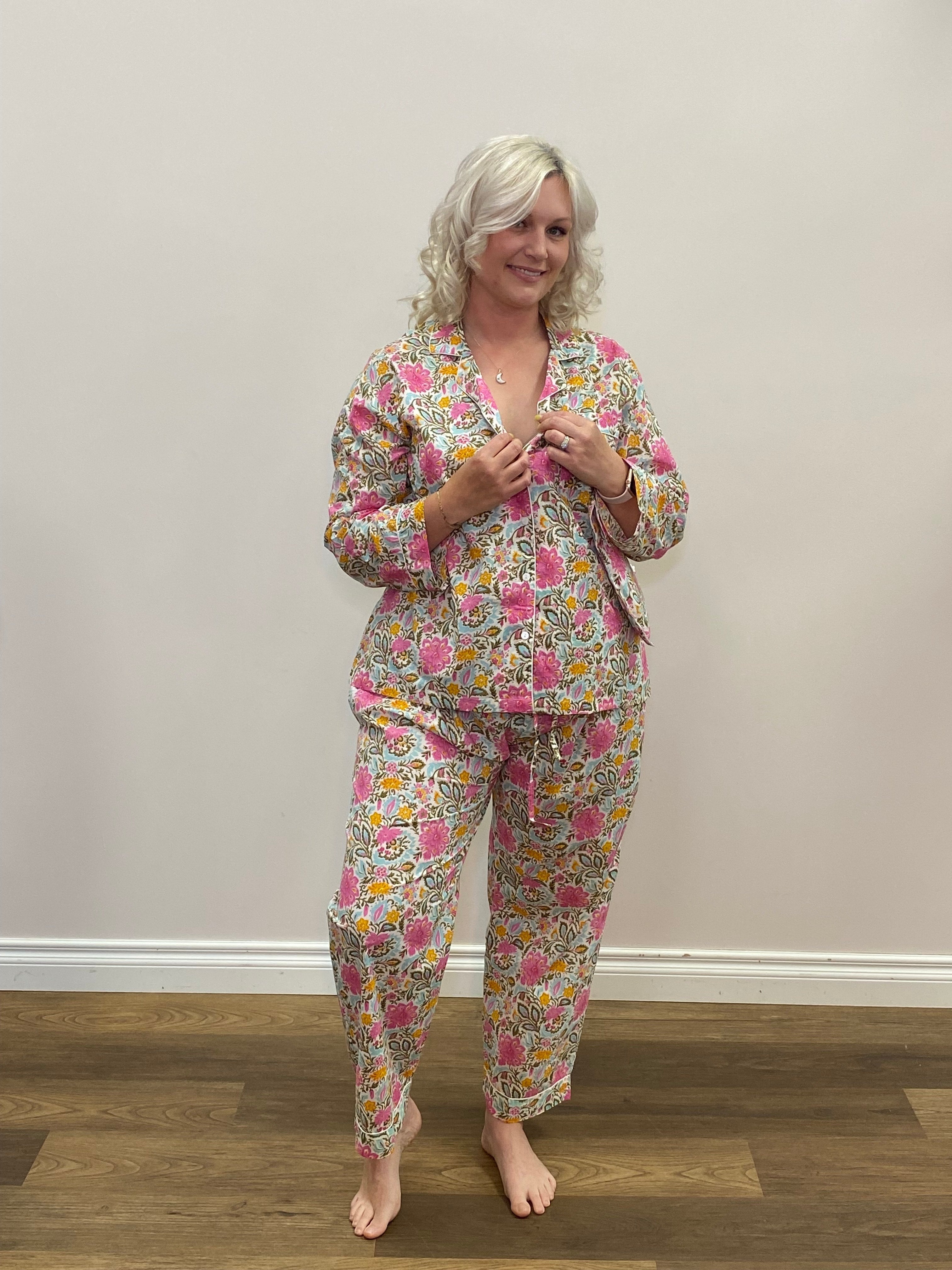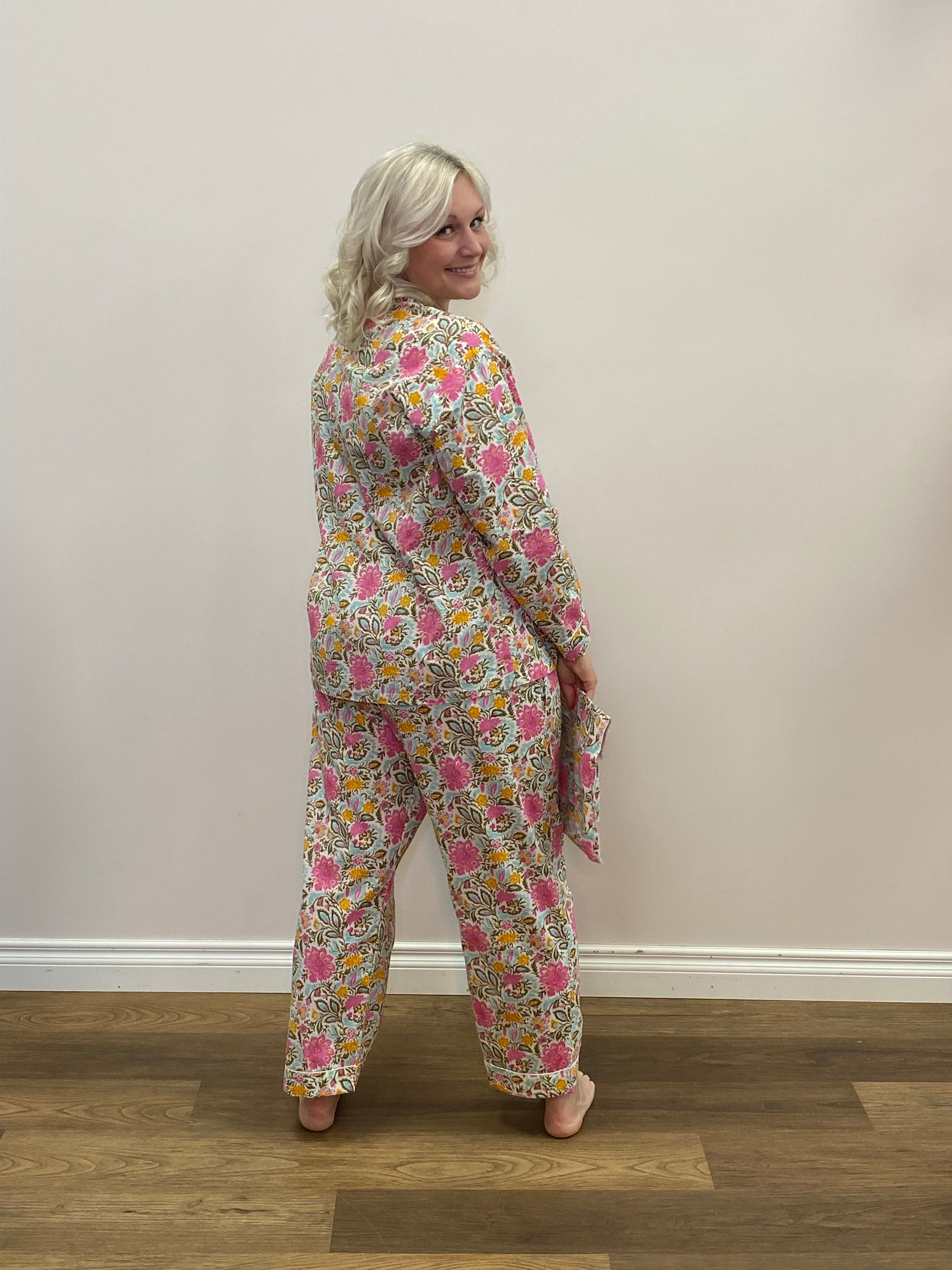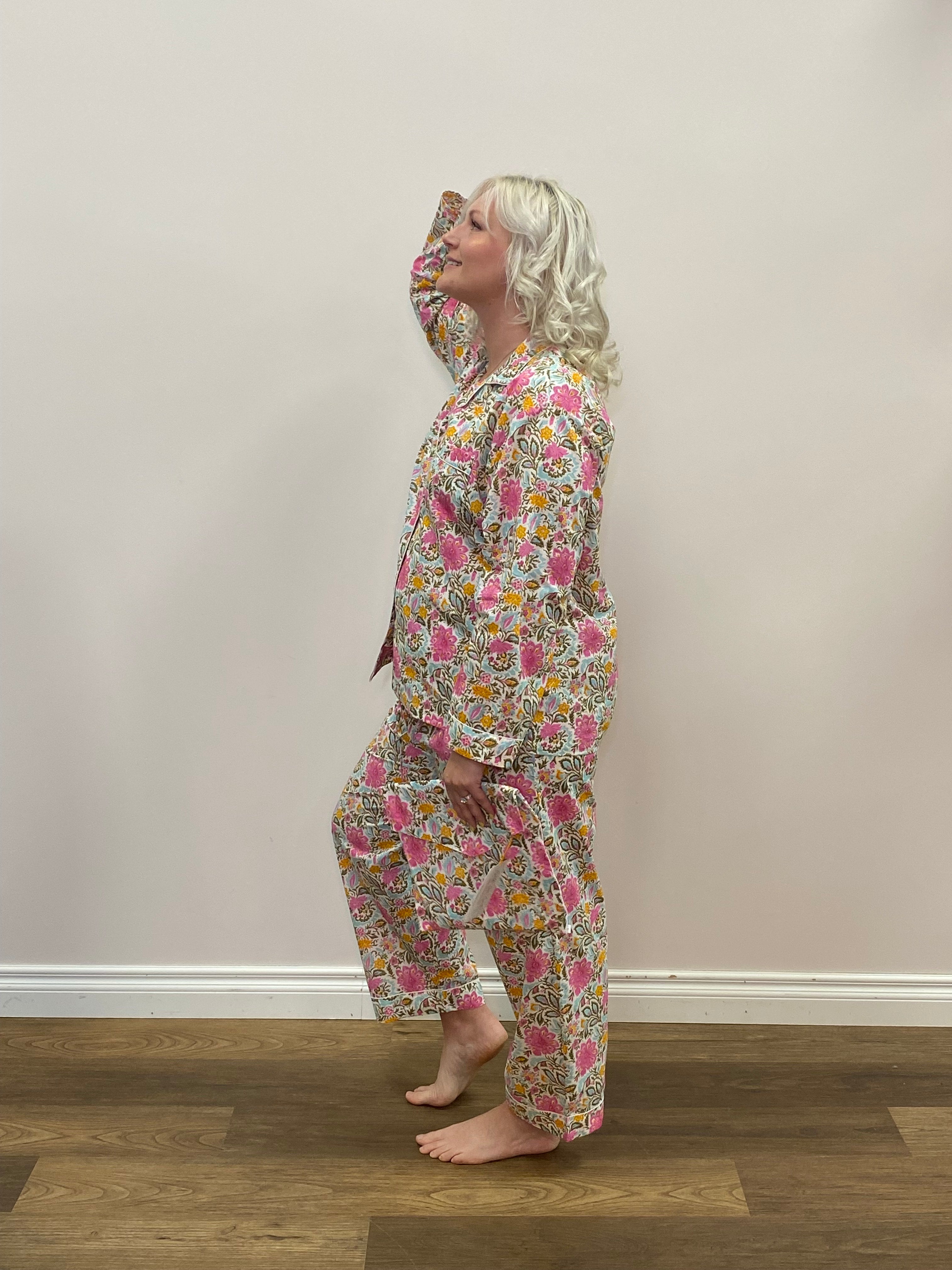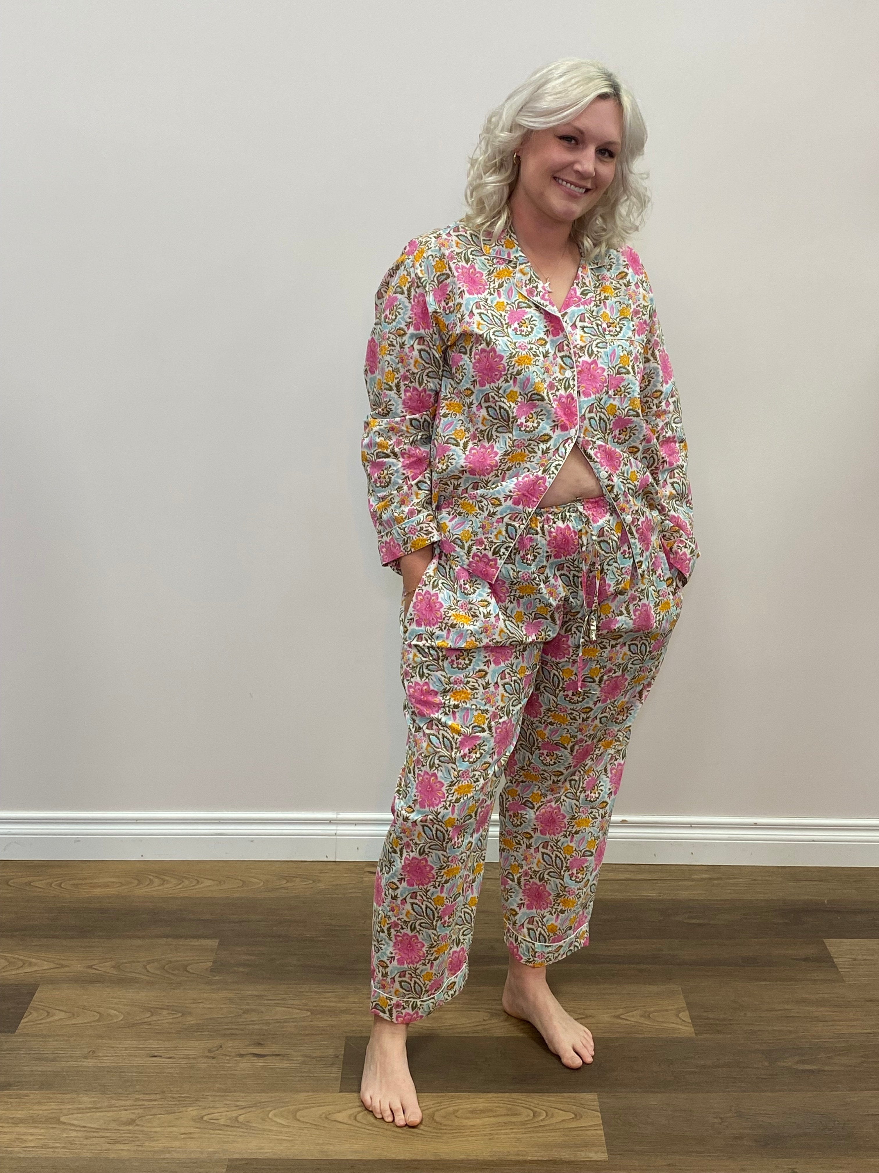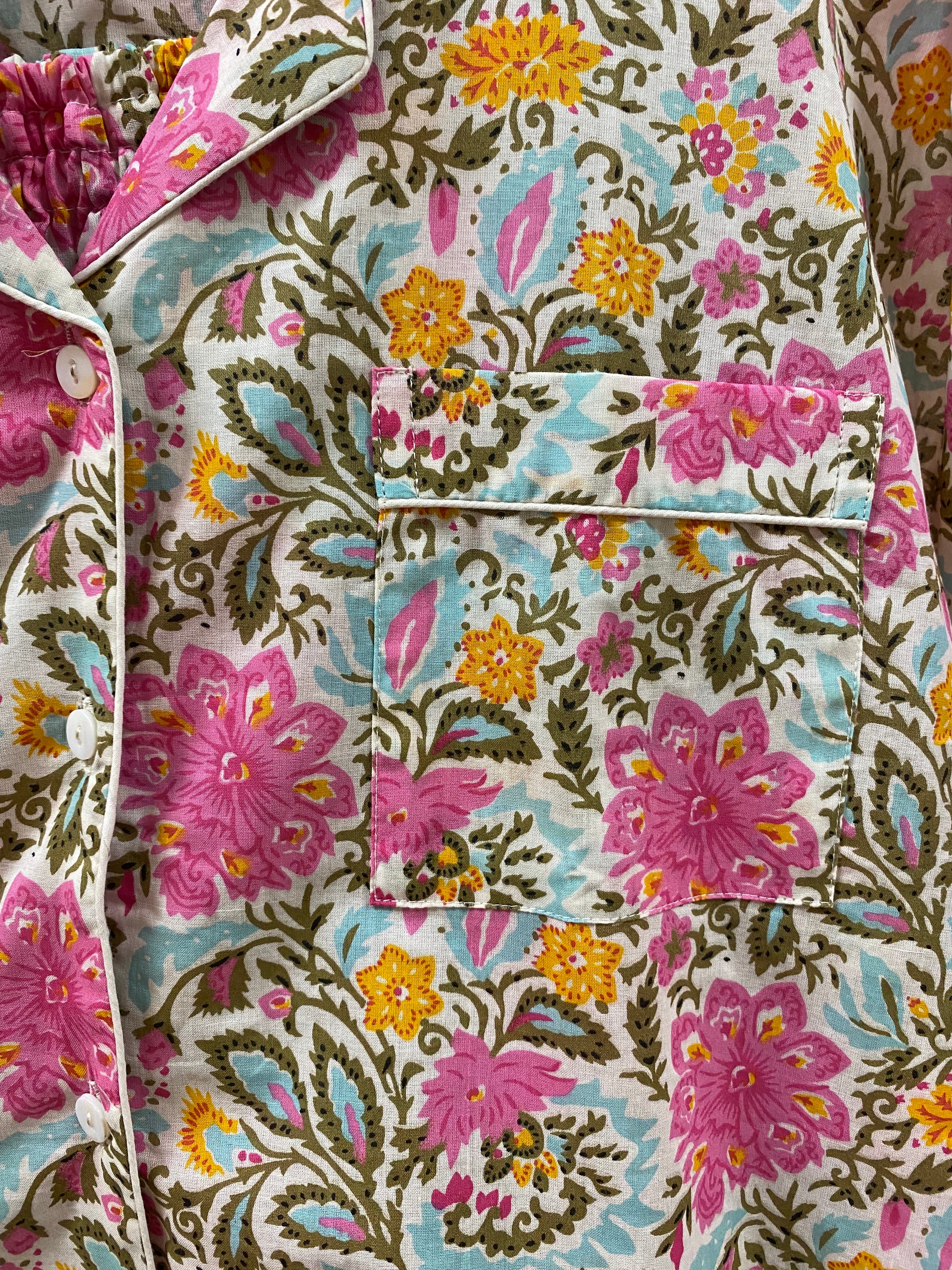 This lightweight two-piece pajama set is a floral dream. Made from 100% soft cotton, it features a vibrant vintage-inspired print in rosy pink, golden marigold, and soft sky blue—bringing joyful charm to your evenings and weekends.