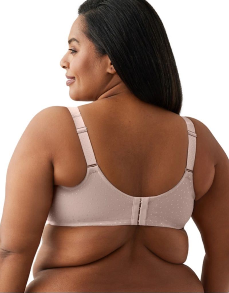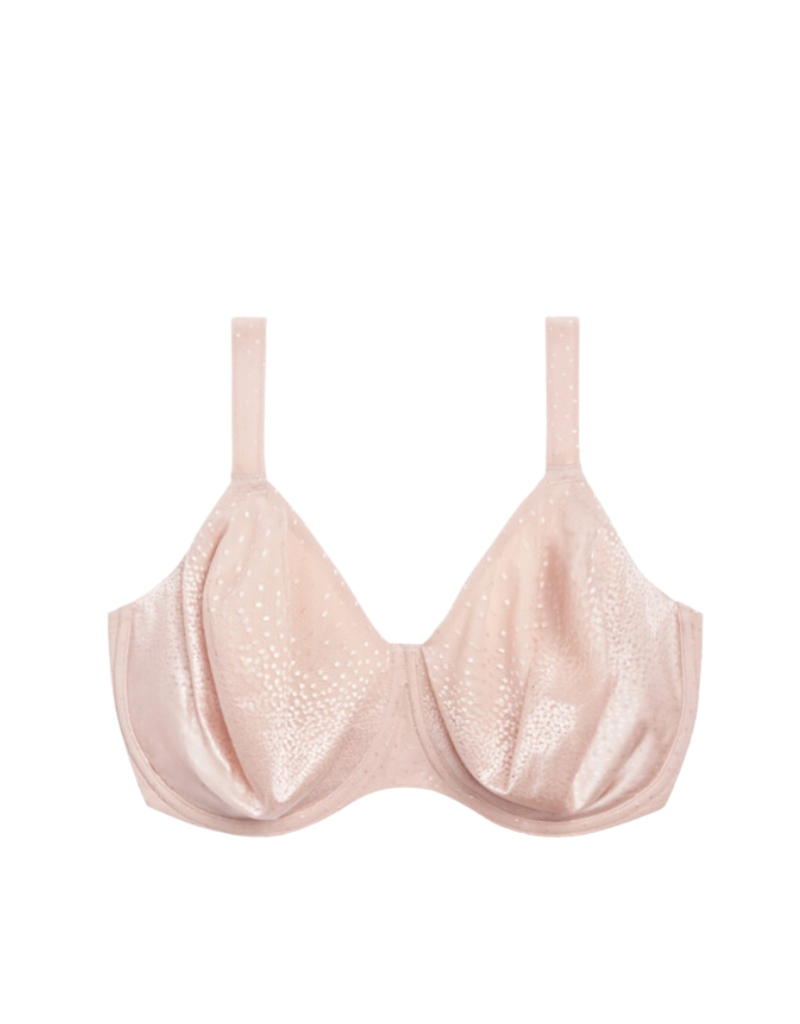 - Full coverage two-ply cups of powerful inner fabric covered with pretty dot jacquard fabric with accent sheen