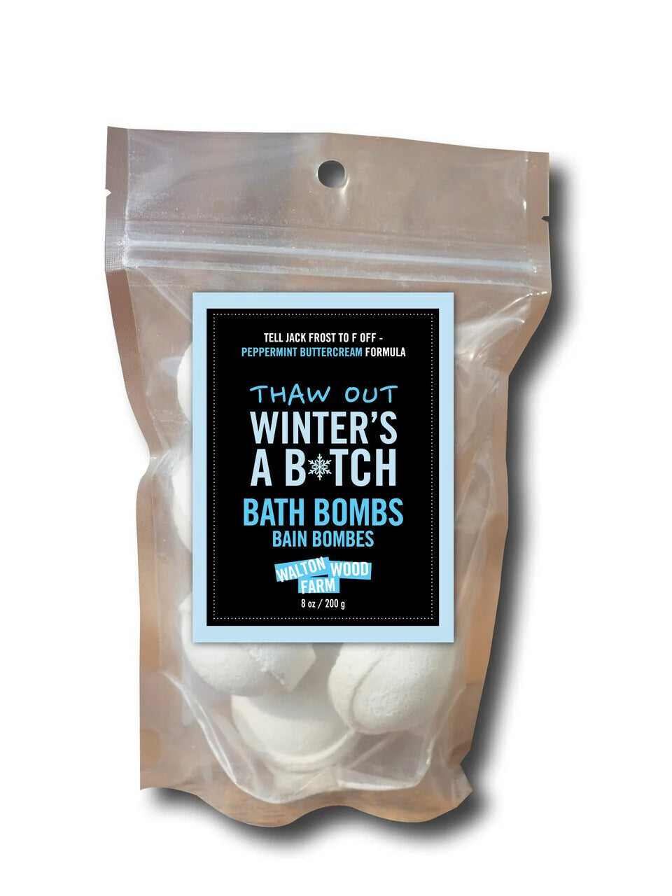 Tell Jack Frost to F Off- Thaw Out Winter's a B*tch Bath Bombs. These 7oz fizzing wonders are here to help you melt away the winter blues (and any icy attitude). Perfect for when snowstorms are threatening your sanity and all you want is a hot bath and a good laugh. SLS, Paraben and Dye Free.