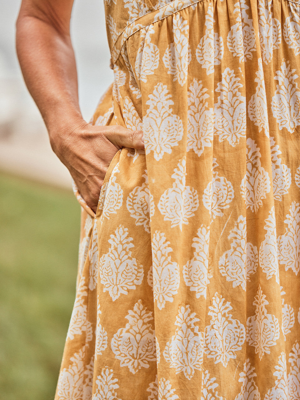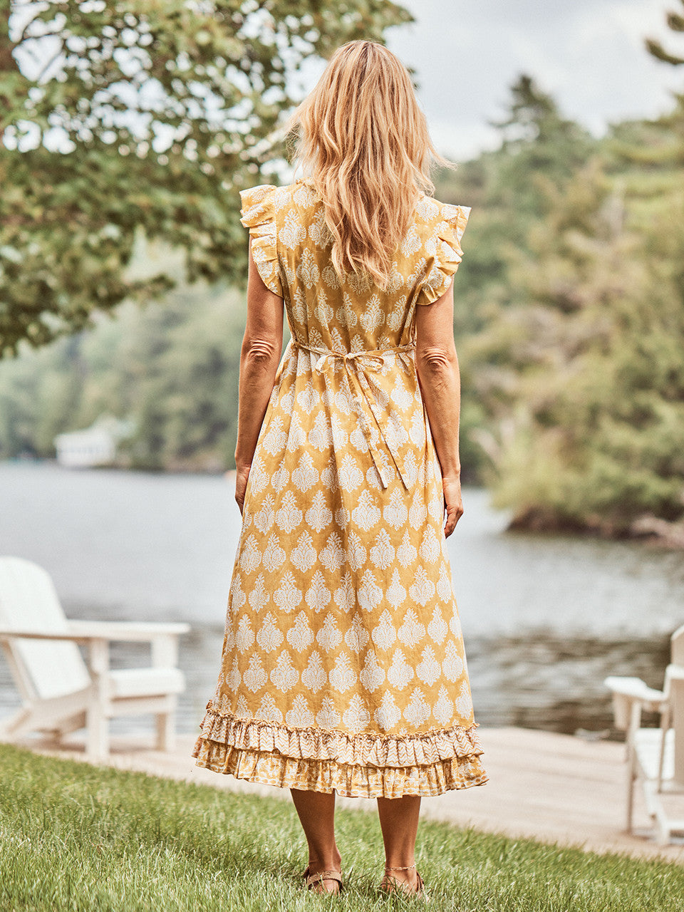Sumptuous gold cotton is the perfect base for this striking block-printed design! Delight in this tiered silhouette, showcasing ravishing ruffles, light gathers, and self-fabric ties.