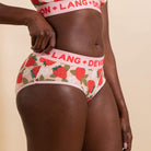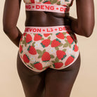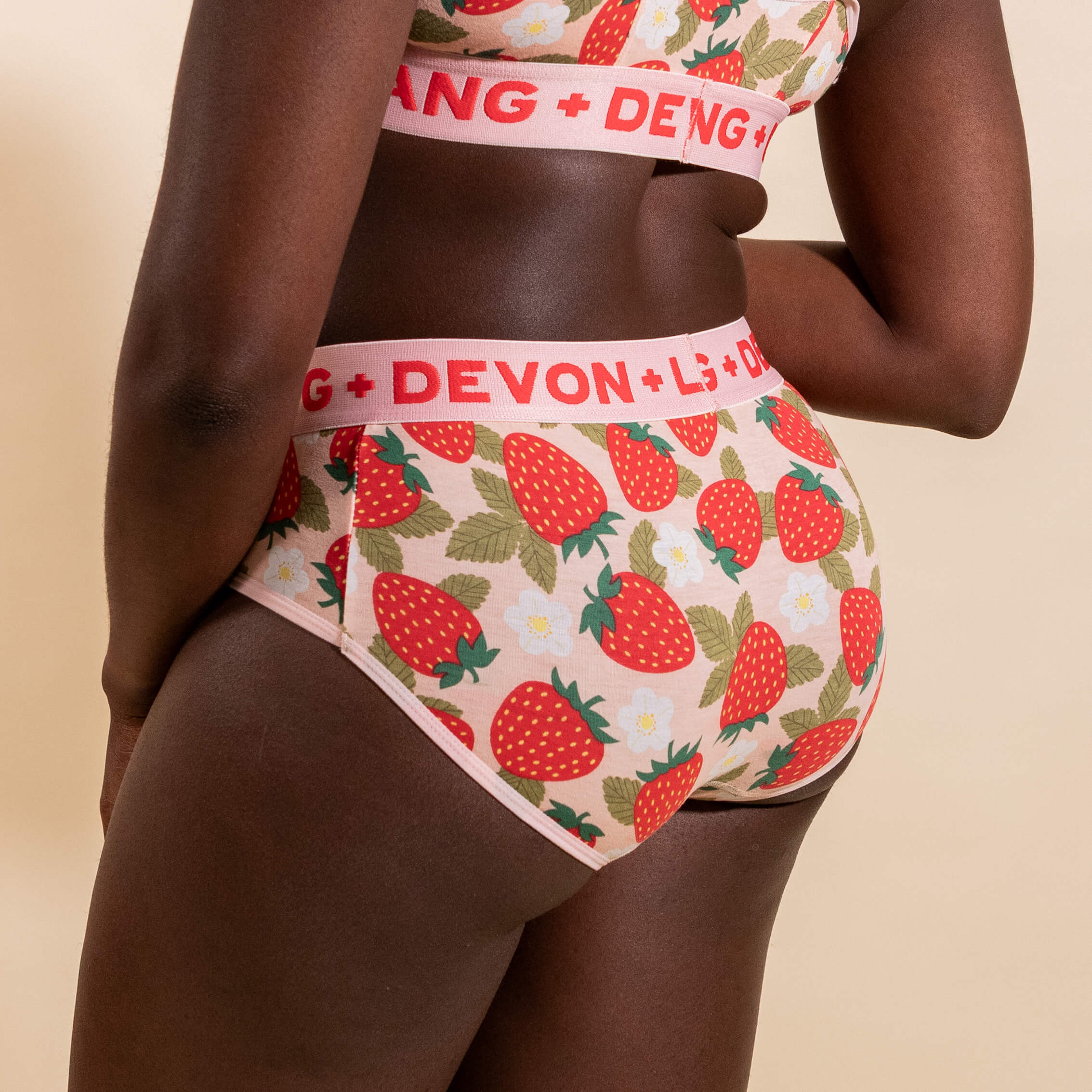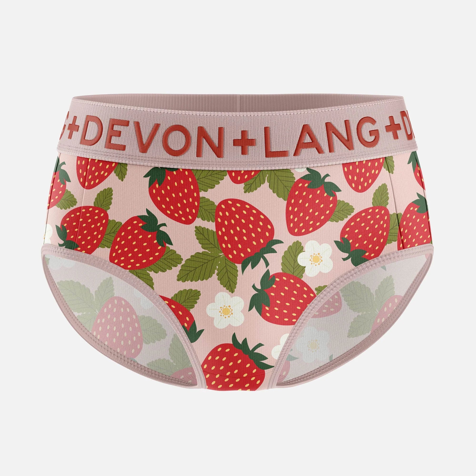 The Devon + Lang Bria Bikini Brief in Wild Strawberry brings soft, breathable comfort to your daily routine with a flattering mid-rise fit and smooth, no-mesh design. Made from an ultra-soft modal-blend fabric, this bikini brief offers gentle stretch, a stay-put waistband, and an easy, lightweight feel that moves with you. The cheerful Wild Strawberry print—complete with bright berries and delicate blossoms—adds a fun, summery twist to a timeless everyday essential.