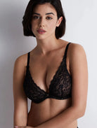The Aubade Rosessence Triangle Plunge Bra in black embodies timeless French seduction with its exquisite lace and plunging neckline. Designed to highlight your natural shape, this elegant silhouette combines soft stretch lace with delicate floral detailing inspired by the beauty of blooming roses. The deep V cut enhances cleavage while providing gentle support, and the gold-tone charm at the center adds a touch of sophistication. Smooth finishes and adjustable straps ensure a flawless fit that feels as beautiful as it looks.